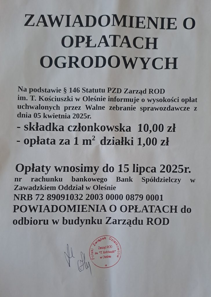 ZAWIADOMIENIE O OPŁATACH OGRODOWYCH !!!